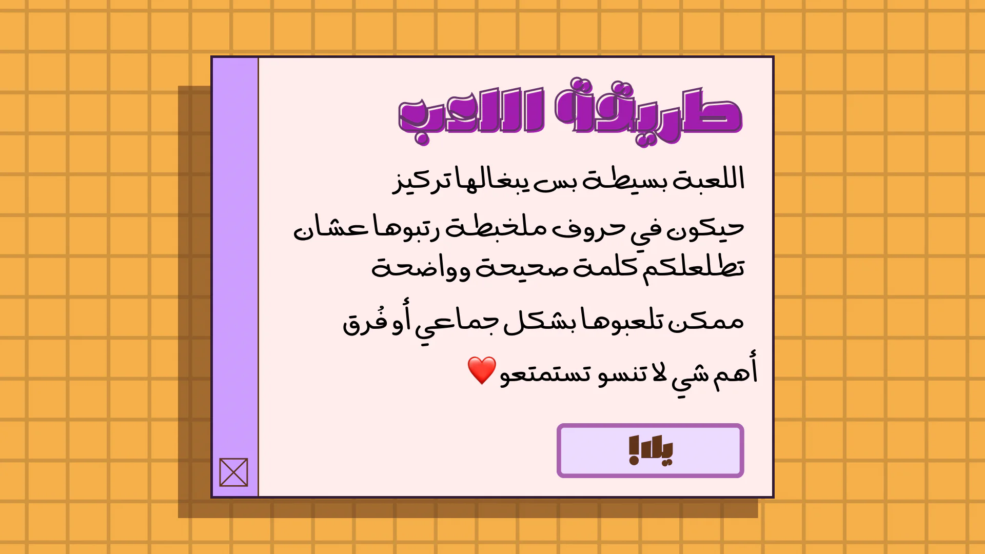 اللعبة عبارة عن كلمات وحروف ملخبطة، ولازم ترتبها عشان تطلع الكلمة الصحيحة. سهلة، ممتعة، وتضيف جو تحدّي وضحك خفيف للجميع.