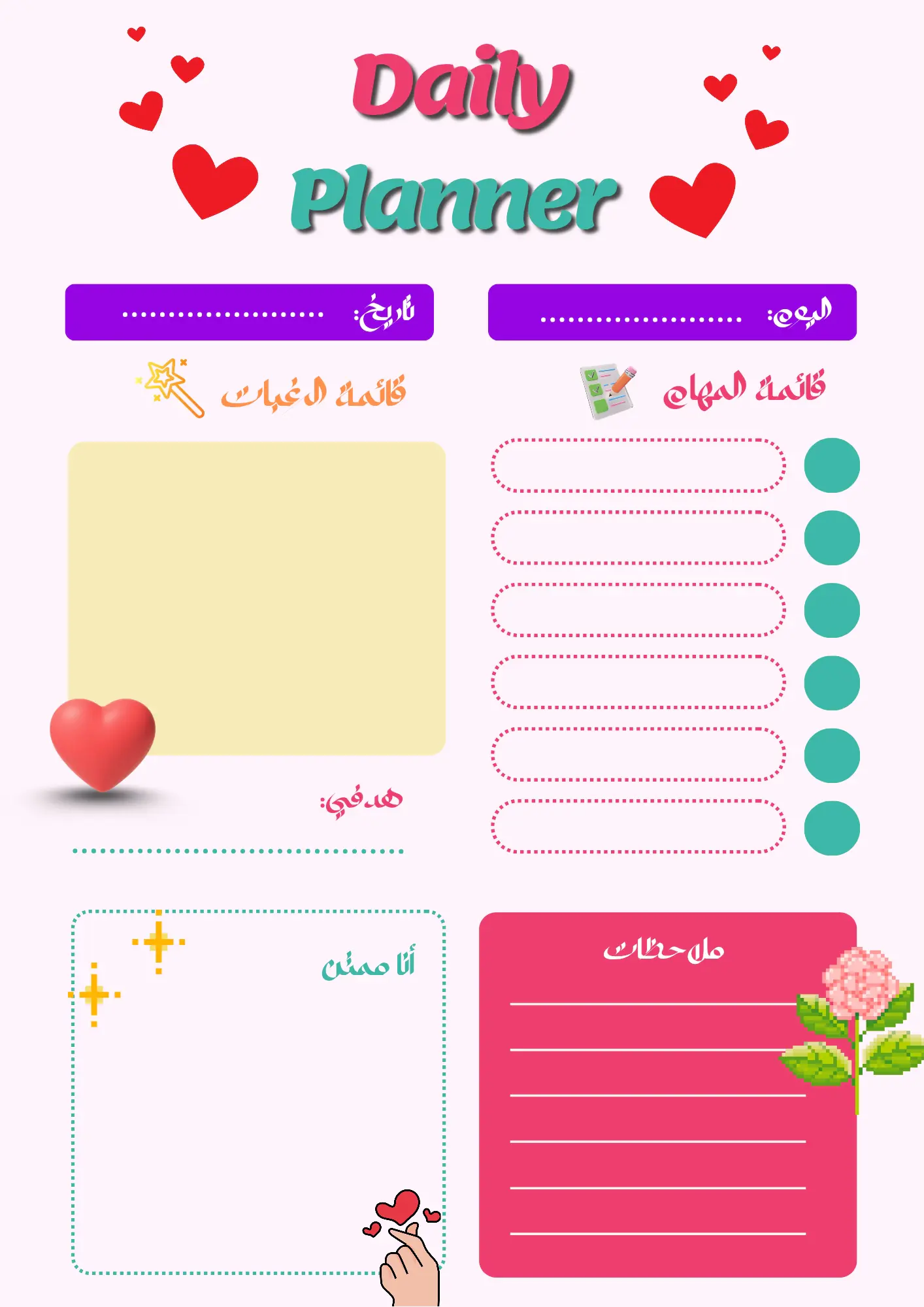 إدارة الوقت بلمسة جمال! مُخطط يومي جذاب مصمم خصيصاً لـ تنظيم المهام وتتبع الأهداف بأسلوب أنيق. مثالي لـ التخطيط اليومي، وتحديد الأولويات، وتدوين العادات. اجعل إنتاجيتك ممتعة! تحميل فوري (PDF ) قابل للتعديل